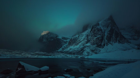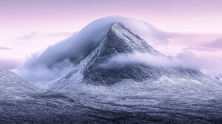 Isolated winter region featuring an ice-covered mountain surrounded by clouds, embodying nature’s quiet strength