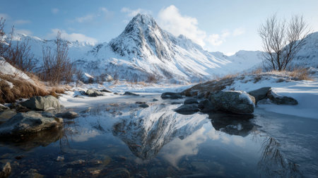 A stunning winter landscape featuring majestic mountains covered in snow, reflecting beautifully in a calm body of water with a serene atmosphere.