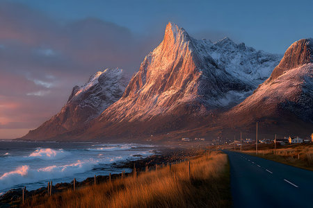 Majestic Coastal Mountain Landscape at Sunset with Snow-Capped Peaks and Ocean Waves Generative AI