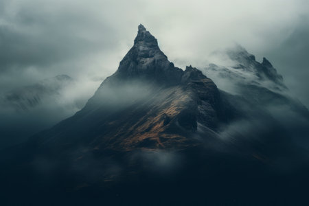Misty mountain peak surrounded by clouds, serene atmosphere. Nature and tranquility concept