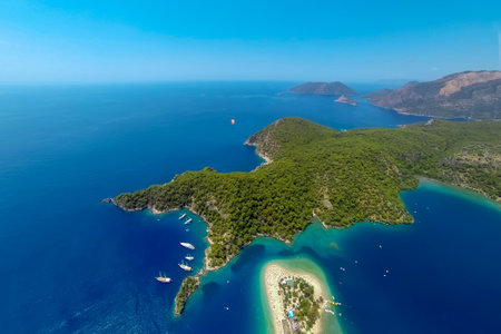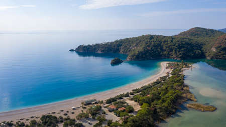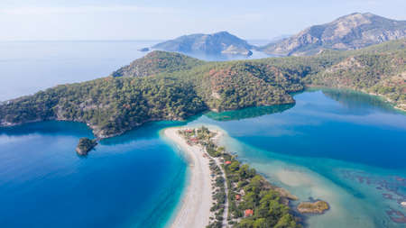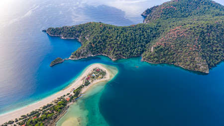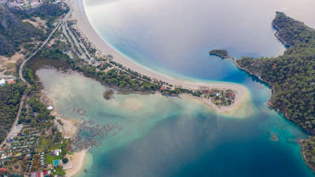 Amazing aerial view of Lagoon in Oludeniz, Turkey. Summer landscape with sea spit, green trees, azure water, sandy beach in bright sunny day. Travel background. Top view of national park.