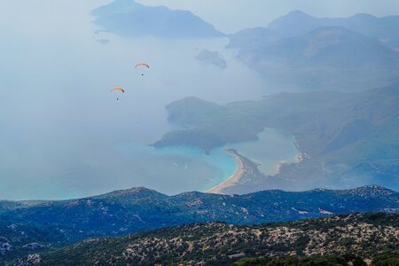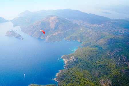 Paragliding in the sky. Paraglider tandem flying over the sea with blue water and mountains in bright sunny day. Aerial view of paraglider and Blue Lagoon in Oludeniz, Turkey.