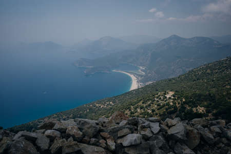 Oludeniz and sand beach in Fethiye, Turkey. Turquoise Coast of southwestern Turkey, taken on Lycian way hiking track on sunny bright day with blue sky in Oludeniz. High quality photo