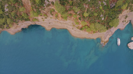 Aerial view of sea lagoon, beach, boat sailing along the mediterranean coast. Landscape of Oludeniz sand beach