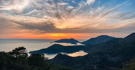 Sunrise above sea and pine tree with blue sea background Turkey