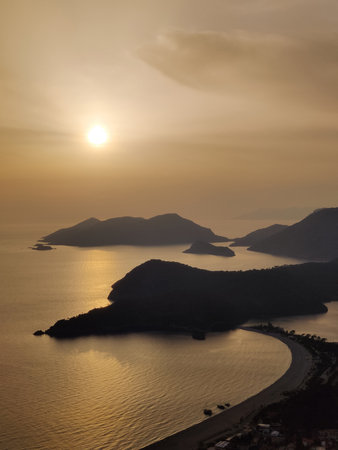Amazing aerial view of beautiful sunset Blue Lagoon in Oludeniz, Turkey. Summer landscape with beach and mountains, green forest, azure water, sandy beach and blue sky in bright sunny day best tourist