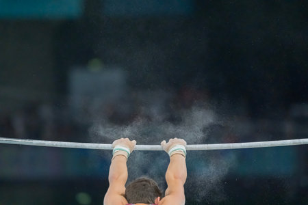 Thessaloniki, Greece, Oct 3 2015: Hands on the barbell. Young athlete getting ready to lift the weights during the course of the Greek Weightlifting Championship
