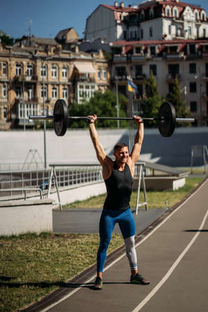 LVIV, UKRAINE - JUNE 2016: Strong athlete bodybuilder strongman lifts heavy dumbbell in front of the audience on a city street