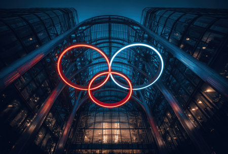 Low-angle view of a glass building with three intersecting neon rings against a blue sky