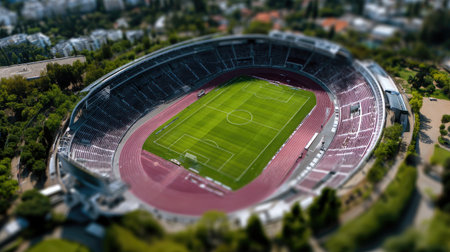 Captured from above, this stunning image showcases a modern stadium, complete with pristine athletic field and ample seating, nestled within an urban environment.