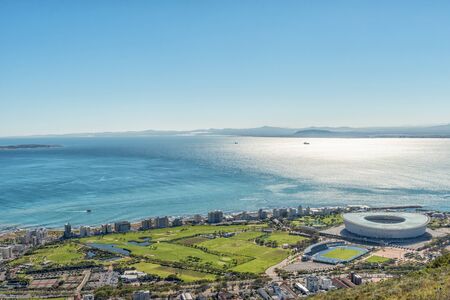 An aerial view of Green Point in Cape Town as seen from Signal Hill. The Cape Town Stadium and other sport facilities are visible. Robben Island is visible