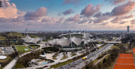 Aerial View of Olympiapark and Olympic Stadium at Sunset in Munich