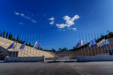 Historic Panathenaic Stadium in Athens, lined with Greek flags and marble stands beneath a vibrant blue sky.