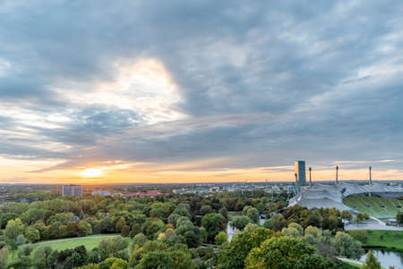 Aerial View of Munich at Sunset with Olympiaturm and Olympic Park