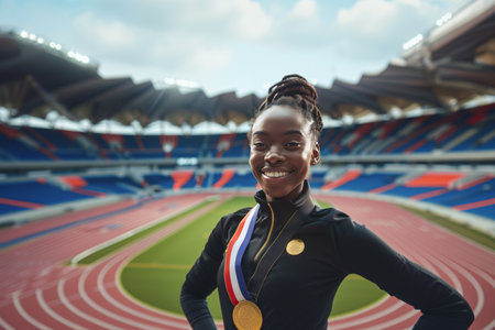 A stunning view of an empty modern stadium, capturing the essence of architectural beauty, dramatic lighting, and vibrant track lines, perfect for sports imagery.