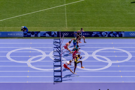 Rushell Clayton (JAM) of Jamaica, competes in the Women's 400m Hurdles Round 1 at the Stade de France Stadium during the 2024 Paris Summer Olympics in Paris, France.