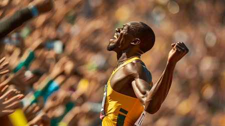 An athlete in yellow raises his fist in victory, embodying triumph. a blurred crowd backdrop highlights his success. A.I.