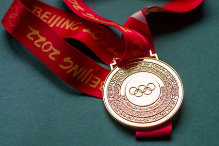 January 14, 2022, Beijing, China. Gold medal of the XXIV Olympic Winter Games on a green background.