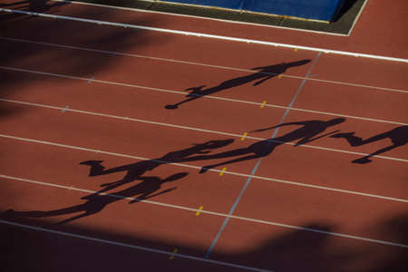 shadows woman runners run on red track stadium of sprint race