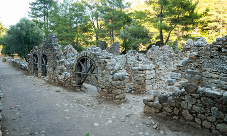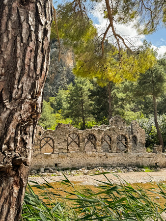 Ancient Stone Ruins with Arched Windows in the Forested Landscape of Olympos, Turkey, Near a Peaceful River