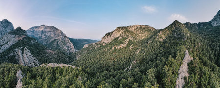 Panorama of countryside in mountain.Green forest on the hills, cliffs
