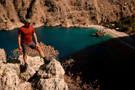 traveler man standing on stone and enjoying view of sea bay