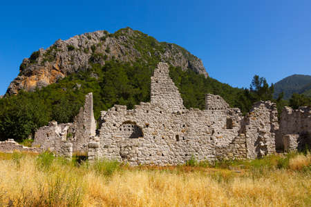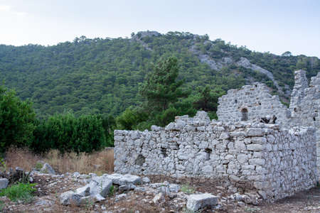 ruins of antique fortress walls on rocky mountain slopes near the ancient city of Olympus, Turkey