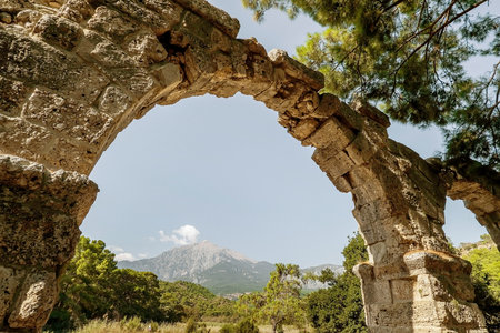 ruins of ancient building in the antique city of Phaselis, Turkey, against the backdrop of Mount Tahtali (Lycian Olympus)