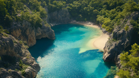 Breathtaking coastal landscape in Turkey with turquoise waters, beach and pine-covered mountains