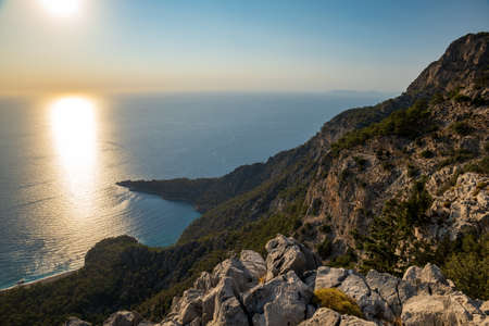 Lycian way hiking and trekking route with sea view at sunset in Turkish Mediterranean area with rocks, mountains. Mountain landscape image