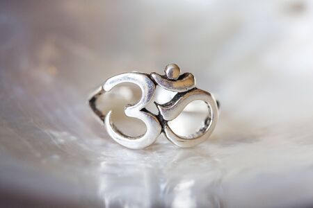 Silver ring tiny jewelry piece on white pearl background in the shape of om