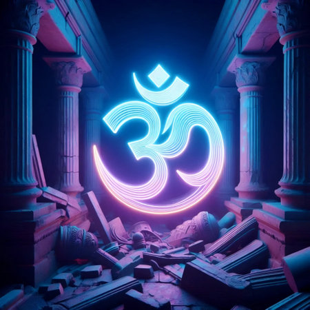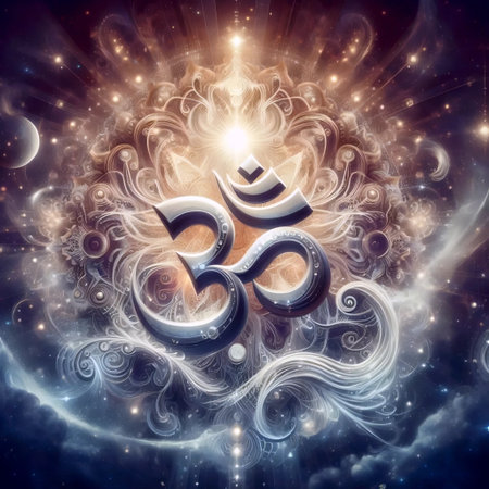 A Glowing Om Symbol with Starry Space Background, Spiritual Energy, Hindu Meditation Mantra, Divine Light Vibration Art for Yoga, Mindfulness, Enlightenment