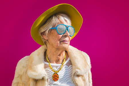 Happy and funny cool old lady with fashionable clothes portrait on colored background - Youthful grandmother with extravagant style, concepts about lifestyle, seniority and elderly people