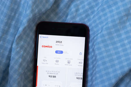 New York, USA - 1 June 2021: comico mobile app logo on phone screen, close-up icon, Illustrative Editorial