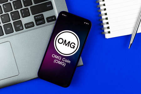 OMG coin symbol. Trade with cryptocurrency, digital and virtual money, banking with mobile phone concept. Business workspace, table top view