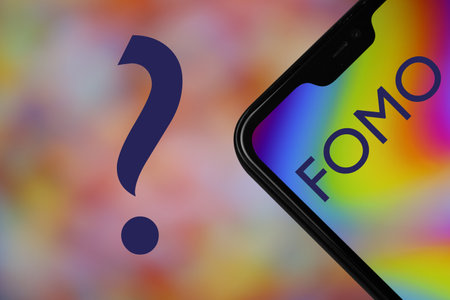 FOMO text on the phone screen. Fear of missing out. Obsessive fear of missing an interesting event or good opportunity, provoked, among other things, by viewing social networks