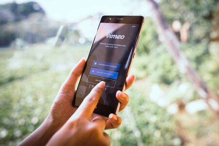 CHIANG MAI, THAILAND - JAN. 19,2019: Woman holding HUAWEI with Vimeo on screen. Vimeo is a video-sharing website in which users can upload, share and view videos.