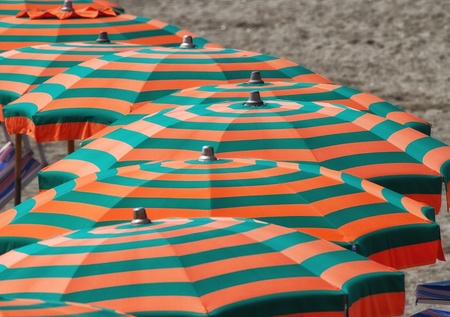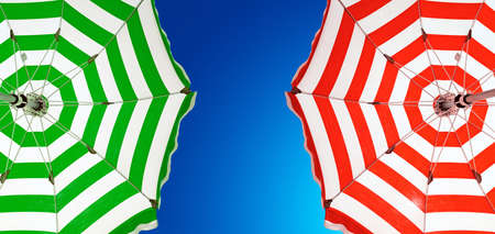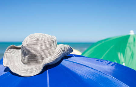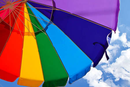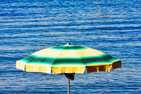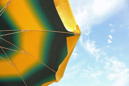 Beach objects and accessories concept. Colorful summer umbrella parasol during summertime weather.