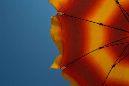 Detail of orange and red sunshade in the beach oover a sunny blue sky
