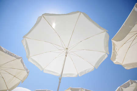 White and blue striped beach umbrellas. Blue sky. Relaxing context. Summer holidays at the sea. General contest and location