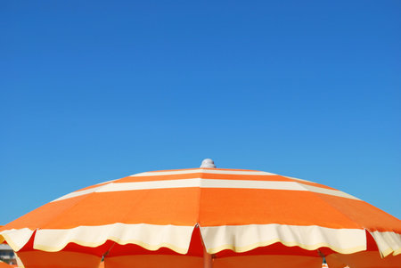 Orange striped beach umbrella over blue sky, free copy space, Rimini, Italy