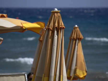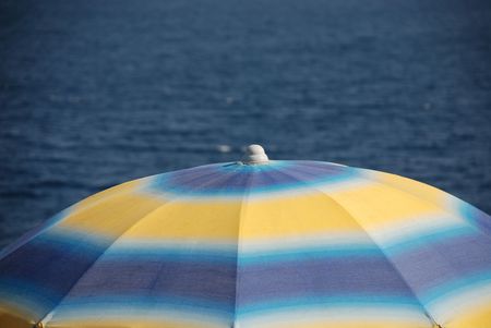 Colorful parasol at island of Krk in Croatia with blue Adriatic sea in background, selective focus