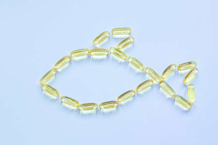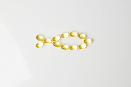Vitamins Fish oil capsules are lined with the shape of a fish. Top view.