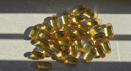A pile of translucent yellow omega 3 fish oil capsules scattered on a light grey surface, illuminated by natural sunlight creating distinct shadows. Represents health, nutrition, and dietary supplements.
