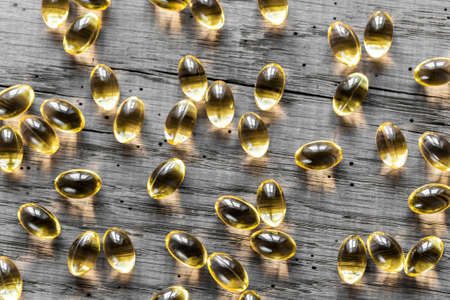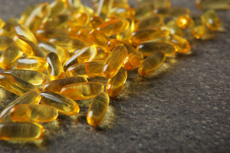 Fish oil capsules pills heap. Medicine background