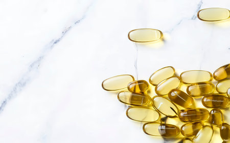 close up view of golden shiny fish oil capsules scattered on yellow bright background
