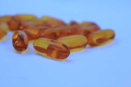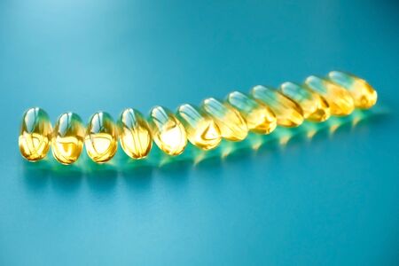 Fish oil fish fat capsules. Omega 3 vitamins in yellow gelatin capsules on a blue background
