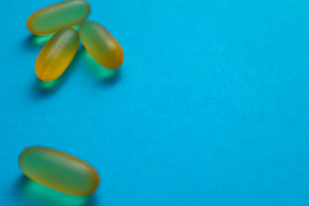 Yellow transparent capsules lie on a light surface