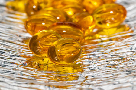 Close-up of golden colored oil supplements, capsule, health concept, pharmaceutical tablets