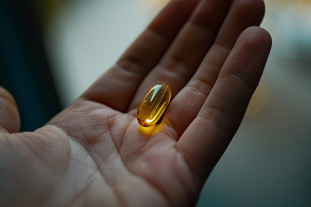 Close up of Omega 3 fish oil capsule in hand with blurred background